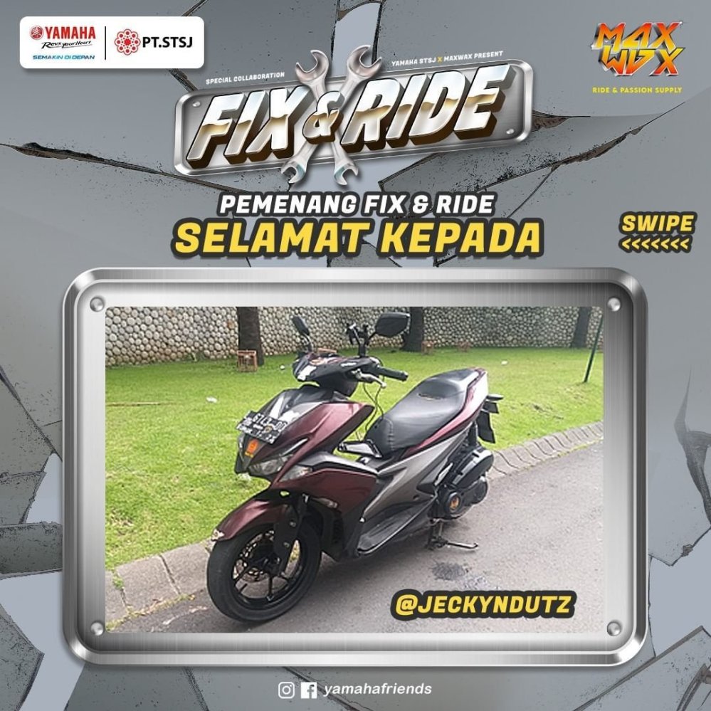 Sob, PT Surya Timur Sakti Jatim (Yamaha STSJ) akhirnya mengumumkan pemenang dari Fix & Ride. Spesial kolaborasi yang dilakukan Yamaha STSJ dengan Maxwax Communal Space untuk memodifikasi Aerox dengan gratis.