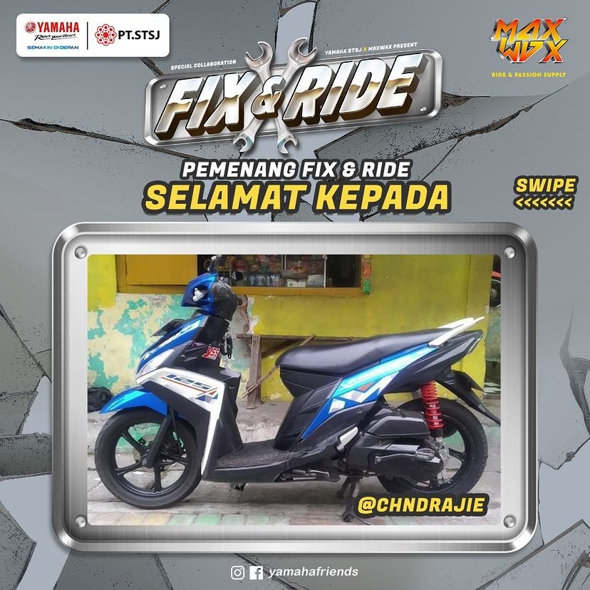 Sob, PT. Surya Timur Sakti Jatim (Yamaha STSJ) akhirnya mengumumkan pemenang Fix & Ride season 2. Melalui akun instagram @Yamahafriends, telah dinyatakan bahwa pemilik akun instagram @chndrajie asal Surabaya berkesempatan mendapatkan restorasi motor gratis dari Yamaha STSJ.