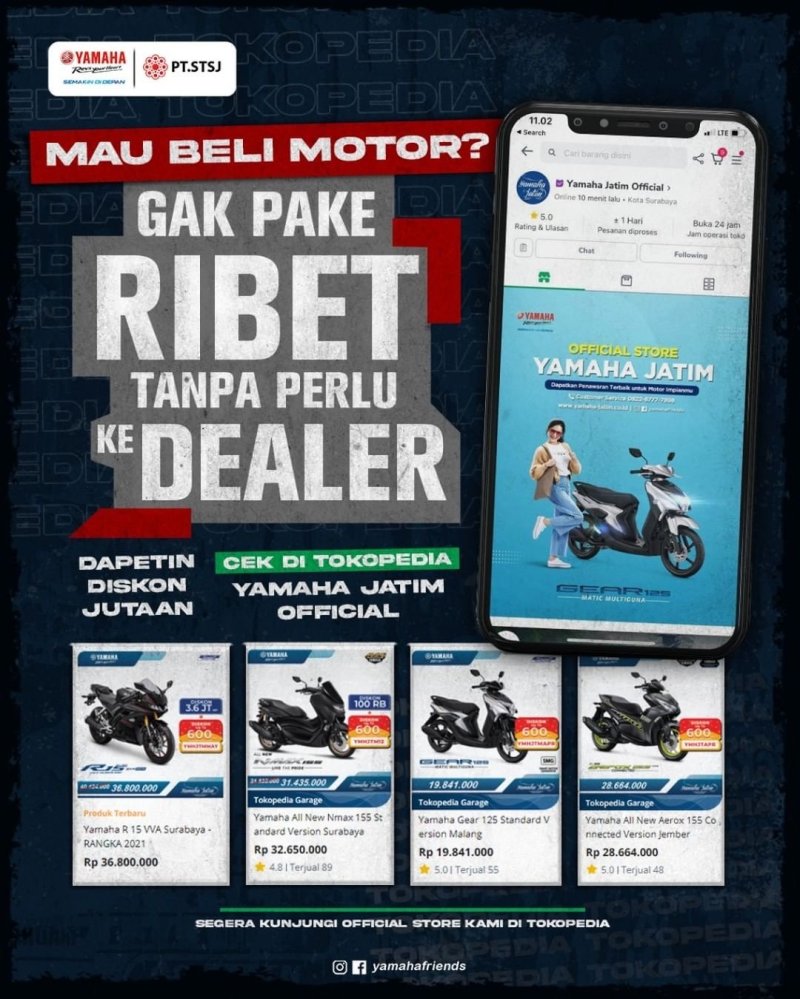 Sob, membeli motor Yamaha kini tambah mudah, murah dan cepat, pasalnya PT. Surya Timur Sakti Jatim (Yamaha STSJ) selaku main dealer motor Yamaha area Jawa Timur, Kalselteng, Kaltim, dan Nusa Tenggara menghadirkan program menarik di bulan Juni 2022 melalui official E-commerce Tokopedia. Yamaha memberikan kemudahan bagi konsumen yang ingin memiliki motor baru tanpa perlu mengunjungi dealer.