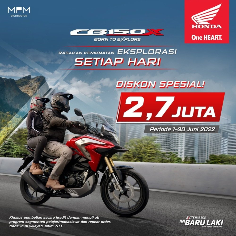 Untuk pembelian pembelian motor sport penjelajah Honda CB150X secara kredit, konsumen akan mendapatkan diskon hingga Rp. 2,7 Juta dan untuk konsumen yang menginginkan sensasi motor super sport melalui teknologi yang di adaptasi langsung dari motoGP Honda CBR 250RR SP , MPM Honda Jatim akan memberikan potongan diskon hingga Rp. 4 Juta. Program promo ini berlaku mulai periode 01 – 30 Juni 2022.