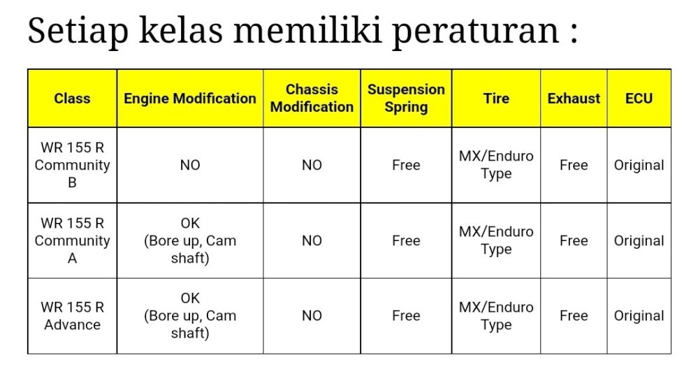 Kompetisi enduro yang menantang ini diikuti oleh total 59 starter. Ada tiga kelas yang dilombakan yaitu WR 155 R Advance berjarak 14 km yang diikuti rider profesional, sedangkan untuk komunitas terdapat dua kelas yakni WR 155 R Community A (11 km) dan WR 155 R Community B (8 km). Semua peserta mengikuti aktivitas ini dengan antusias dan bersemangat dalam menghadapi rintangan-rintangan di trek off road. Dengan menggunakan WR 155 R, kualitas dan keunggulan motor “The Real Adventure Partner” ini terbukti dapat mendukung mereka untuk makin menikmati adventure di ajang ini.