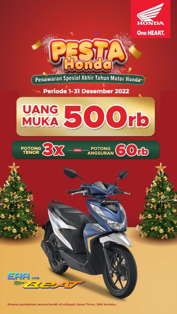 Melalui program PESTA Honda, Penawaran Spesial Akhir Tahun Motor Honda, MPM Honda Jatim memberikan kemudahan bagi konsumen yang ingin memiliki Honda BeAT. Cukup bayar Rp. 500 ribu saja, konsumen sudah bisa memiliki Honda BeAT. Selain itu juga MPM Honda Jatim juga memberikan fasilitas potongan angsuran tiga kali atau Rp 60 ribu. Promo ini berlaku mulai periode 01 – 31 Desember 2022.