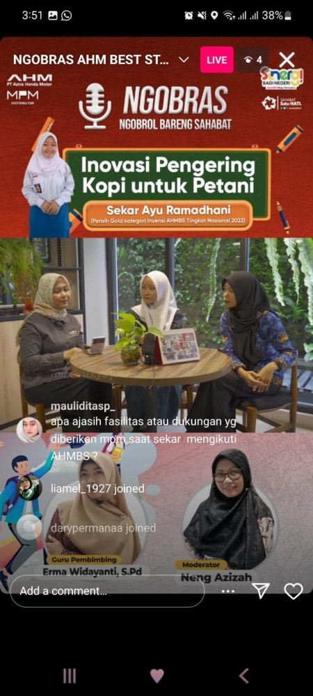 Setelah berlangsung selama kurang lebih 1 jam, sesi ngobrol pun diakhiri dengan Sekar mengajak generasi muda khususnya di Jatim ikut dalam ajang AHM Best Student ini dengan mengangkat ide kreatif, dan melihat peluang yang ada di sekitar untuk dituangkan ke dalam sebuah karya.
