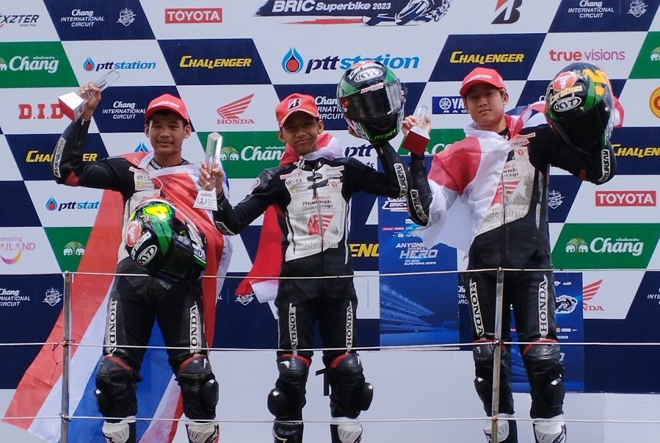 Sob, persembahan membanggakan untuk Indonesia diberikan secara sukses oleh pebalap binaan PT Astra Honda Motor (AHM) Decksa Almer Alfarezel yang berhasil pastikan uara di ajang balap Honda Thailand Talent Cup (TTC) 2023. Pada balapan putaran kelima yang dihelat di Chang International Circuit, Buriram, Thailand (22-23/9), rekan setimnya Muhammad Kiandra Ramadhipa juga tak kalah membanggakan karena berhasil mengalahkan pebalap tuan rumah dan mendapat raihan podium tertinggi di balapan kedua.