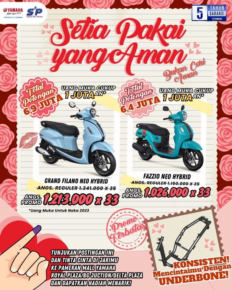 Sob, perayaan hari kasih sayang, PT. Surya Timur Sakti Jatim (Yamaha STSJ), sebagai main dealer motor Yamaha di area Jawa Timur dan Nusa Tenggara, telah meluncurkan program spesial bagi konsumen setia Yamaha. Dalam periode bulan Februari 2024, Yamaha memberikan penawaran istimewa bagi konsumen yang tertarik untuk memiliki skuter matic kelas atas dari Yamaha.