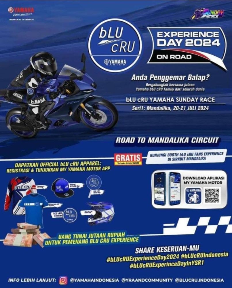 Spesial momen kali ini Yamaha turut memberikan hadiah menarik lainnya diantaranya Uang Tunai Jutaan Rupiah untuk para pemenang bLU cRU Experience. Jangan lupa untuk membagikan momen keseruan bersama bLU cRU Family lainnya melalui akun Instagram menggunakan hashtag #bLUcRUExperienceDay2024 #bLUcRUIndonesia #bLUcRUExperienceDayInYSR1.
