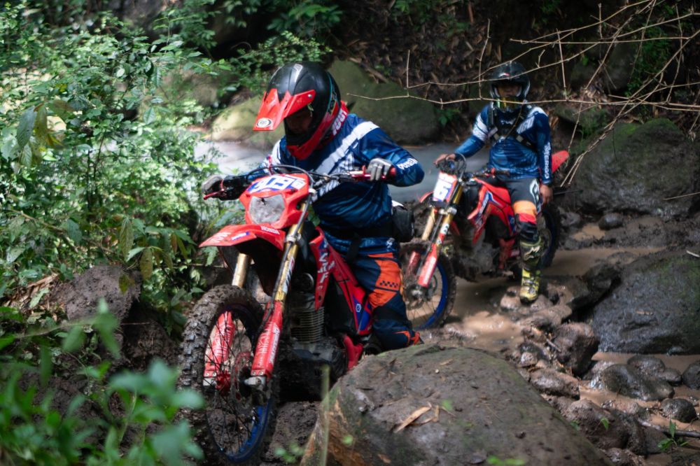 Honda CRF150L tampil sebagai motor andalan sepanjang kegiatan. Dengan tagline “Unlimit Your World”, model ini menawarkan performa dan teknologi yang dirancang untuk menghadapi berbagai kondisi jalur. Suspensi Showa inverted 37mm, Pro-Link rear suspension, wavy disc brake berdiameter besar, rangka yang tangguh, serta panel meter digital compact memberikan stabilitas, kontrol, dan kenyamanan optimal saat melewati jalur berbatu, turunan ekstrem, hingga tanjakan tajam. Kombinasi fitur dan karakter mesin responsif membuat Honda CRF150L menjadi pilihan tepat bagi pecinta adventure dan off-road.