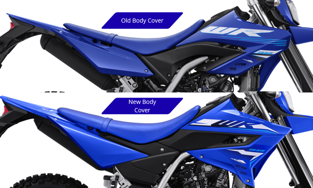 Desain body baru itu tersaji pada bagian body cover depan hingga ke belakang. Bagian body cover Yamaha WR155 R 2026 kini meng-highlight penampilan body yang lebih rapat & padat. Bagian hitam di bawah jok motor, semakin memberikan kesan & citra off-road yang lebih menonjol dari sebelumnya. Garis horizontal yang tegas, mulai dari penutup samping hingga penutup radiator dan fender depan menciptakan tampilan yang kuat dan modern, seolah-olah sedang melaju ke depan.