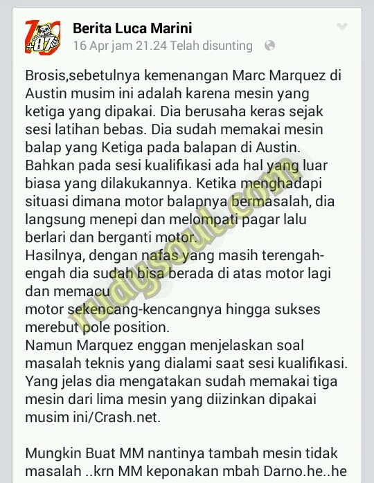 marc marquez gunakan mesin ke3 Published 17/04/2015 at 540 × 698 in marc marquez gunakan mesin ke3 Silahkan Share ke Teman Sobat. Bagikan ke X(Membuka di jendela yang baru) X Bagikan pada Facebook(Membuka di jendela yang baru) Facebook Bagikan ke WhatsApp(Membuka di jendela yang baru) WhatsApp Bagikan ke Linkedln(Membuka di jendela yang baru) LinkedIn Bagikan ke Telegram(Membuka di jendela yang baru) Telegram Lagi Berbagi di Tumblr(Membuka di jendela yang baru) Tumblr Cetak(Membuka di jendela yang baru) Cetak Kirim email tautan ke teman(Membuka di jendela yang baru) Surat elektronik Suka Memuat...