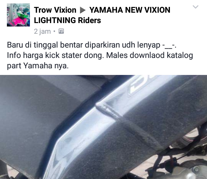 Sob,pengalaman kurang menyenangkan dialami seorang biker yang mengaku kehilangan kick starter motor vixion saat ditinggal parkir.